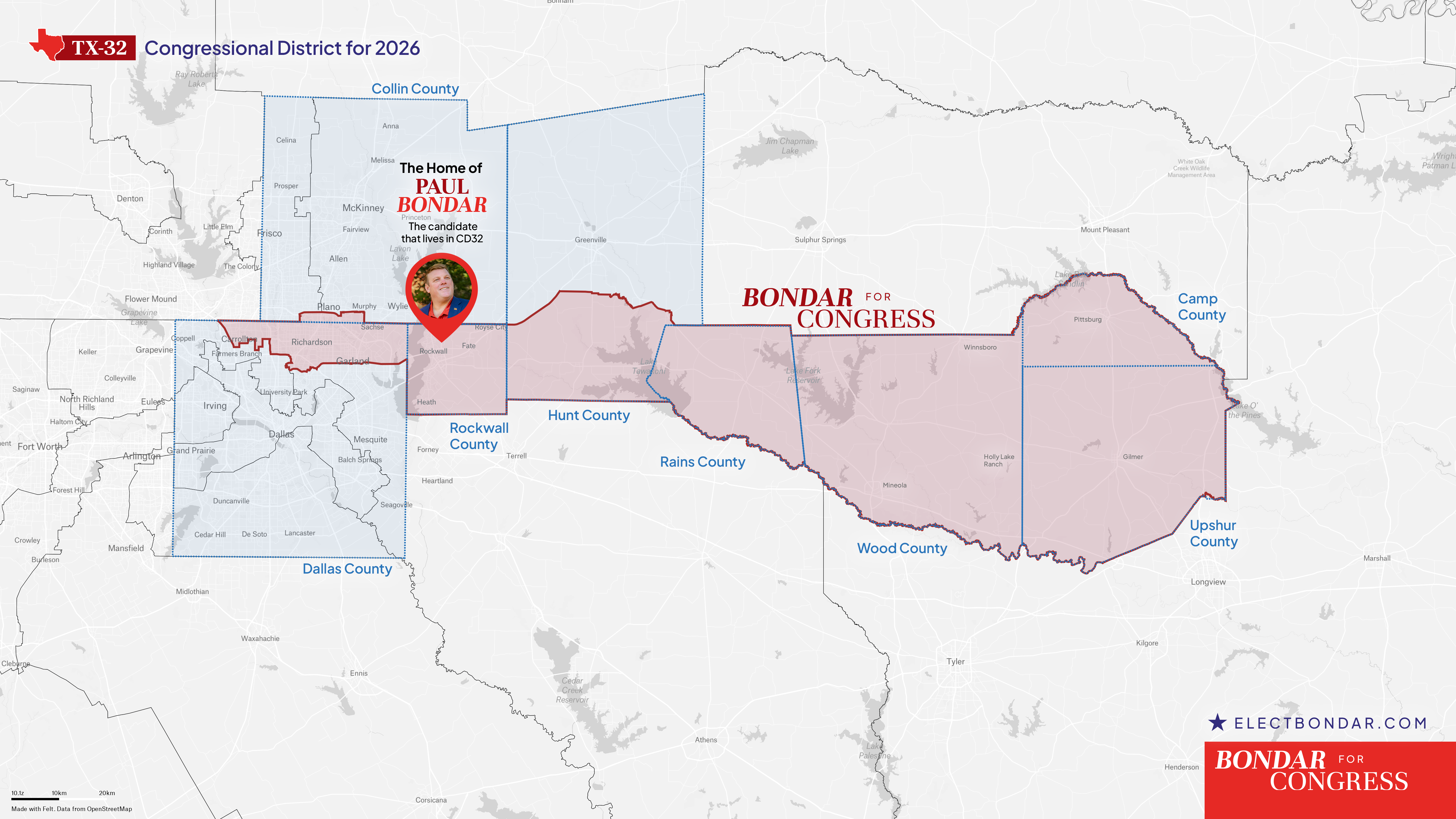 Paul Bondar has called this region home for years and is committed to representing the hardworking families across all eight counties of the new TX-32.